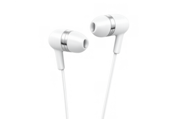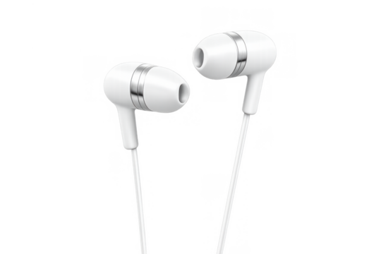 White wired earphones providing audio technology for listening to music, podcasts, and digital sound content