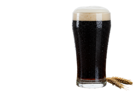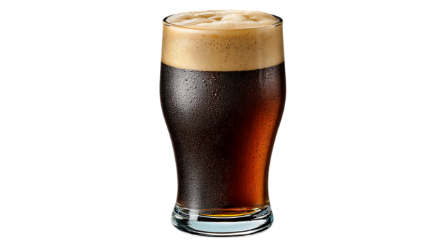 Tall glass of dark beer with frothy head isolated on transparent background