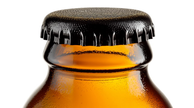 Detailed Close-Up of a Brown Beer Bottle Neck and Black Cap on Clear