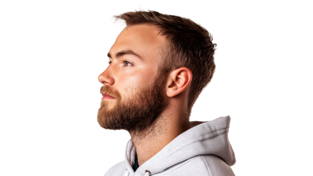 Smiling woman looking upwards, expressive and joyful, isolated on a white background.