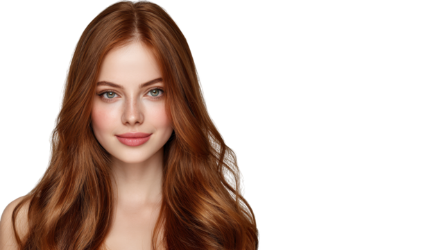 Elegant woman with long, flowing hair in a pink dress, studio portrait capturing beauty and style.