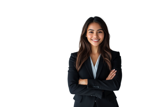 Business woman portrait isolated on white transparent background, businesswoman in suit, crossed arms, PNG