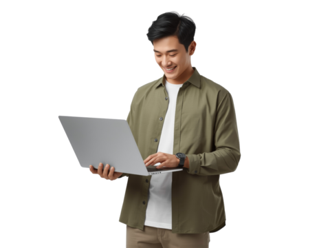 Smiling young man in a green polo shirt, holding a smartphone and power bank, portraying casual connectivity, modern life, and customer service