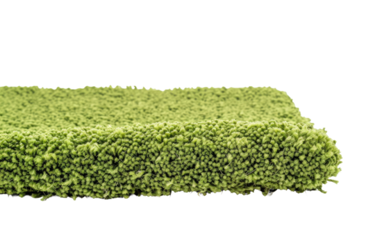 Close Up of a Green Rug. This image portray a detailed view of a green rug laid flat on a clean white background. The texture of the rug stands out showcasing its intricate pattern and shade of green.