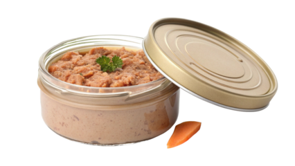 A jar of pt with a sprig of parsley and a slice of carrot, isolated on transparent background