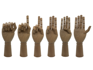 Row of wooden jointed hands denoting the numbers zero through to five