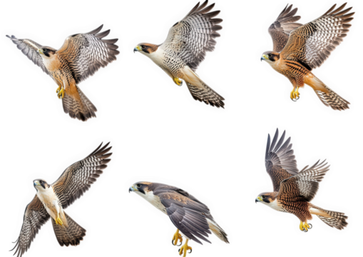 collection of six illustrations of falcons in various flying poses. showcasing their wings and body movements the illustrations highlight the beauty and agility of these birds of prey. ideal for educa