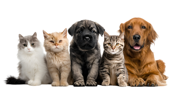 A family poses with their dog against on a transparent background, smiling and enjoying their time together, PNG format.
