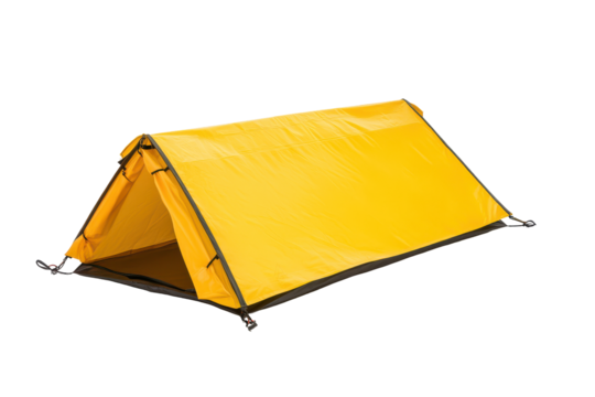 Yellow a frame camping tent isolated on transparent background. Bright yellow camping tent situated isolated on white background.
