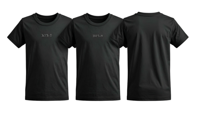 Three black t-shirts, front and back views, with subtle, light-colored text on the front