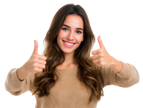 Happy brunette woman giving thumbs up isolated on transparent background