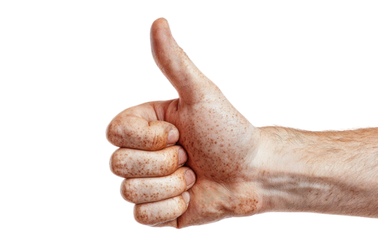A close-up, isolated shot of a right hand giving a thumbs-up sign against a black background