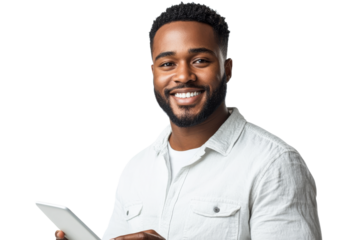 Smiling man holding tablet with confident demeanor