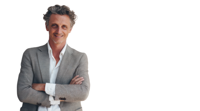 Confident man in a stylish blazer smiling with arms crossed, showcasing a positive demeanor against a neutral backdrop.