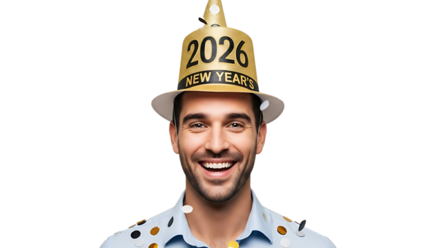 A smiling man wearing a 2026 New Year's hat on transparent background