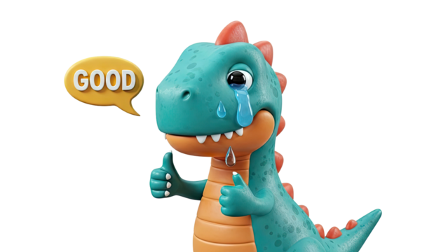 Crying Dinosaur Gives Thumbs Up with "GOOD" Speech Bubble