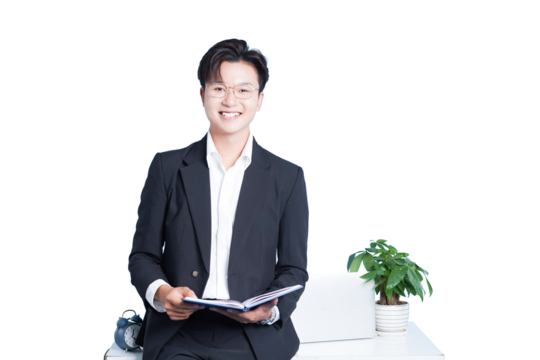 Confident Business Professional: A sharp-dressed young professional radiates poise and success, holding a notebook while seated atop a clean desk in a modern office.