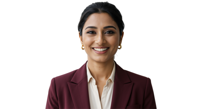 Professional Portrait of a South Asian Woman in Formal Attire Smiling Against a Plain Black Background