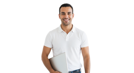 Young man smiles while holding a laptop in a bright, clean environment during a casual moment