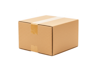 Brown cardboard box mockup illustrating square shipping carton for delivery logistics and postal package branding presentation isolated on transparent background