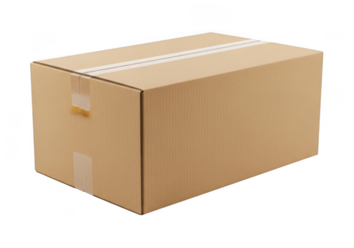 Cardboard box isolated PNG on transparent background, brown corrugated container with tape for shipping and storage, packaging material