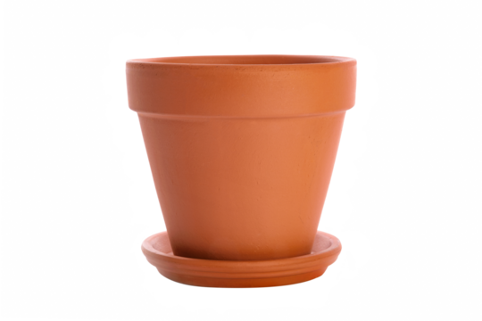 Single brown clay flower pot with saucer isolated on a transparent background.