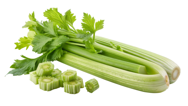 Low-calorie, low-fat, and hydrating vegetable celery rich in vitamin K, vitamin A, vitamin C, folate, and potassium isolated on transparent background