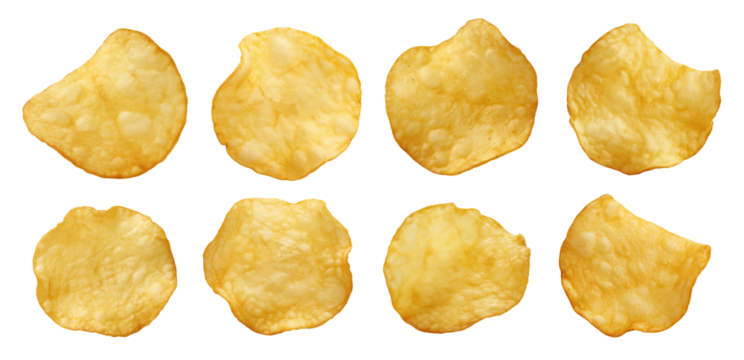 Viewed from above, a selection savoury potato chips, crisps, party food snacks isolated against a transparent background.