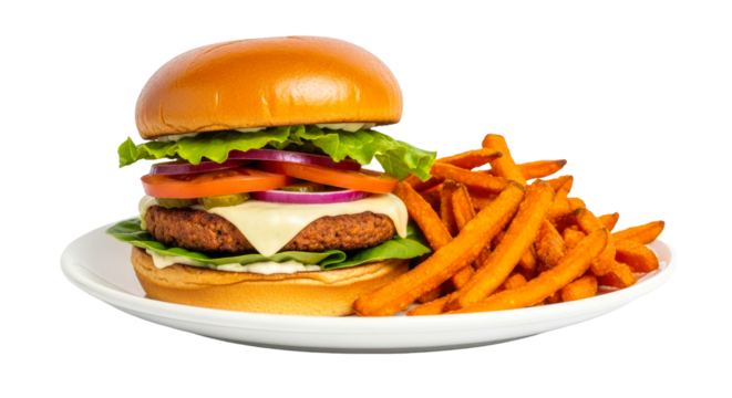 Delicious veggie burger with sweet potato fries isolated on transparent background