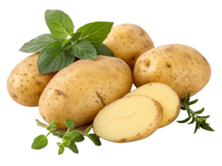 Three varieties of potatoes whole and sliced isolated on transparent background
