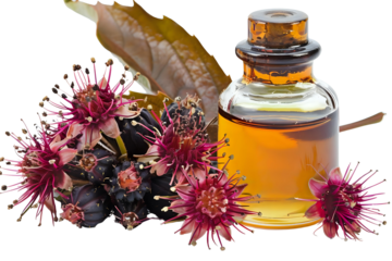 AI Image: Botanical elixir with exotic blossoms showcasing nature's potency in a bottle against a