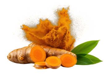 Extreme macro of a split turmeric root with glistening slices, emerald leaves, and erupting golden powder, on a transparent studio background with dramatic light. Concept of organic potency and