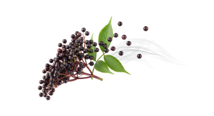 Freshly Harvested Elderberry Cluster with Lush Green Leaves and Dynamically Dispersed Berries, Symbolizing Natural Wellness, Potency, and Antioxidant-Rich Goodness on a Pure White Background