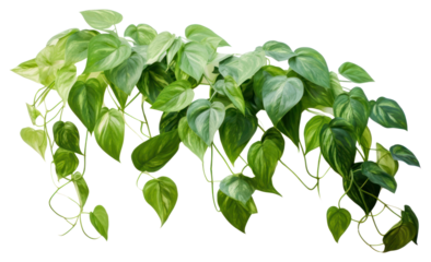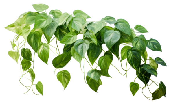 Lush green pothos plant cascading elegantly from a hanging pot isolated on white background