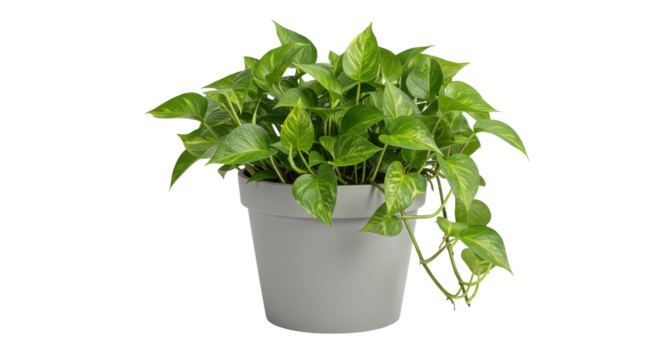 Lush green pothos plant in a simple gray pot enhancing indoor decor with vitality isolated on white background
