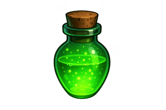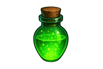 Green potion in glass bottle with cork isolated PNG, magical elixir for fantasy games and Halloween decorations