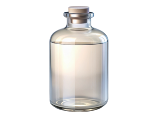 Transparent glass bottle filled with clear liquid isolated on transparent background elegant container