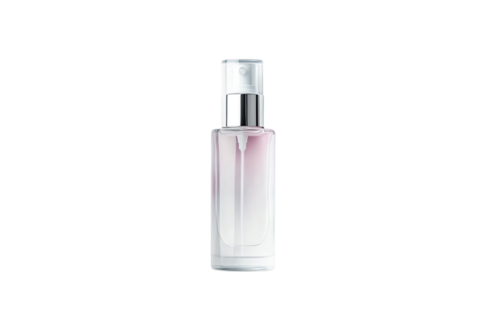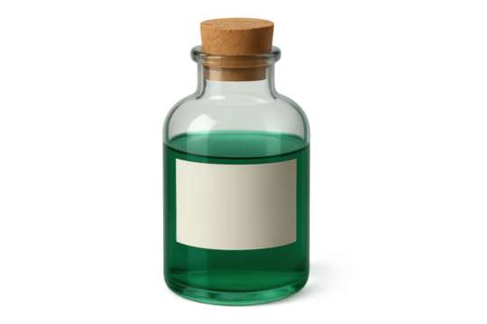 Green liquid in glass bottle with cork stopper, isolated on transparent.