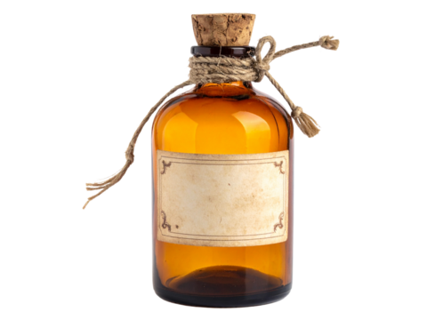 Vintage amber glass apothecary bottle with blank label and twine, isolated on white background for medicine, potion, or herbal remedy concepts.