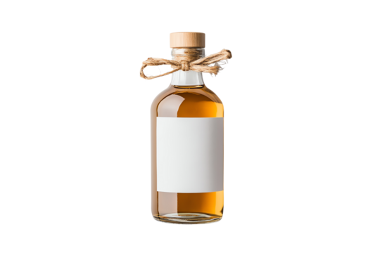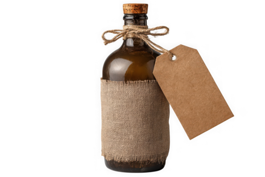 Vintage glass bottle with woven texture and blank tag isolated on transparent background