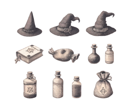 A collection of witchcraft symbols including pointed hats, spellbooks, and potion bottles, arranged on a transparent background