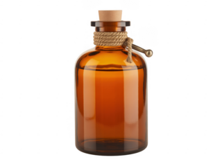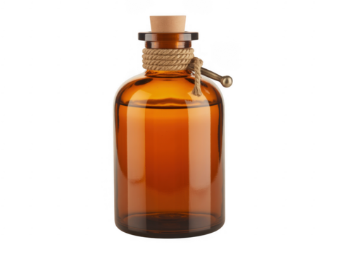 Amber glass bottle with cork stopper and rope amber bottle brown bottle isolated on a transparent background