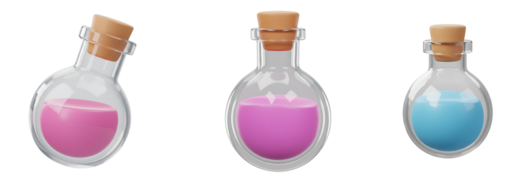 Magical potions in clear glass bottles with cork stoppers ready for fantasy game or science experiment with transparent background