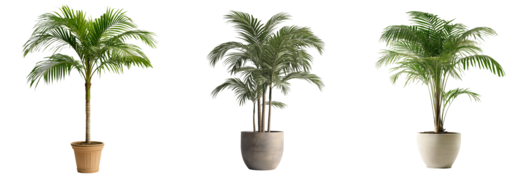 A potted palm tree with tall, arching fronds and a textured trunk, isolated on a transparent background