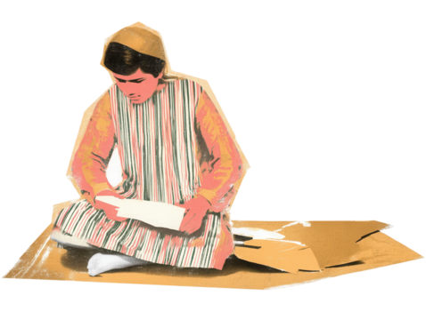 Person intently working on a pottery wheel, shaping clay with hands and tools on a white background