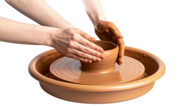 Close-up of hands shaping clay on a pottery wheel isolated on transparent background. Png
