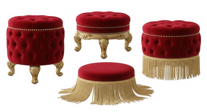 Luxurious red velvet ottomans with golden details isolated on transparent background