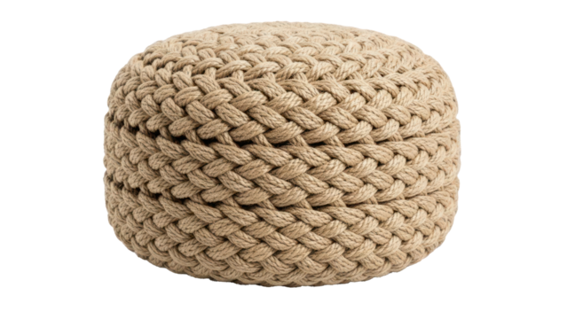 Stylish pouf seating made of braided jute rope natural color isolated on white background