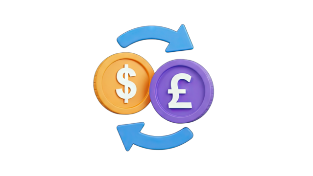 3D Currency exchange icon with dollar and pound symbols on transparent background