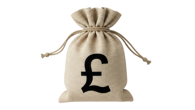 Money bag with pound symbol isolated PNG, sack of cash on transparent background for finance and currency concepts